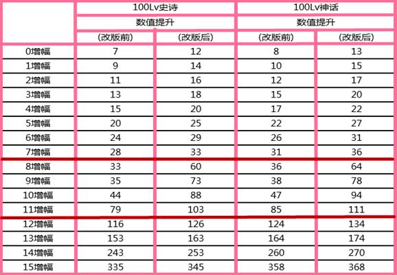 2021年版本地下城与勇士增幅改版前100级史诗装备增幅14可以增加243点力量,增幅改版后100级史诗装备增幅14可以增加253点力量,100级神话装备增幅改版前增幅14可以增加26点力量,增幅改版后100级神话装备增幅14可以增加270点力量,再附上100史诗/神话装备增幅改版前后各增幅等级数值对比。